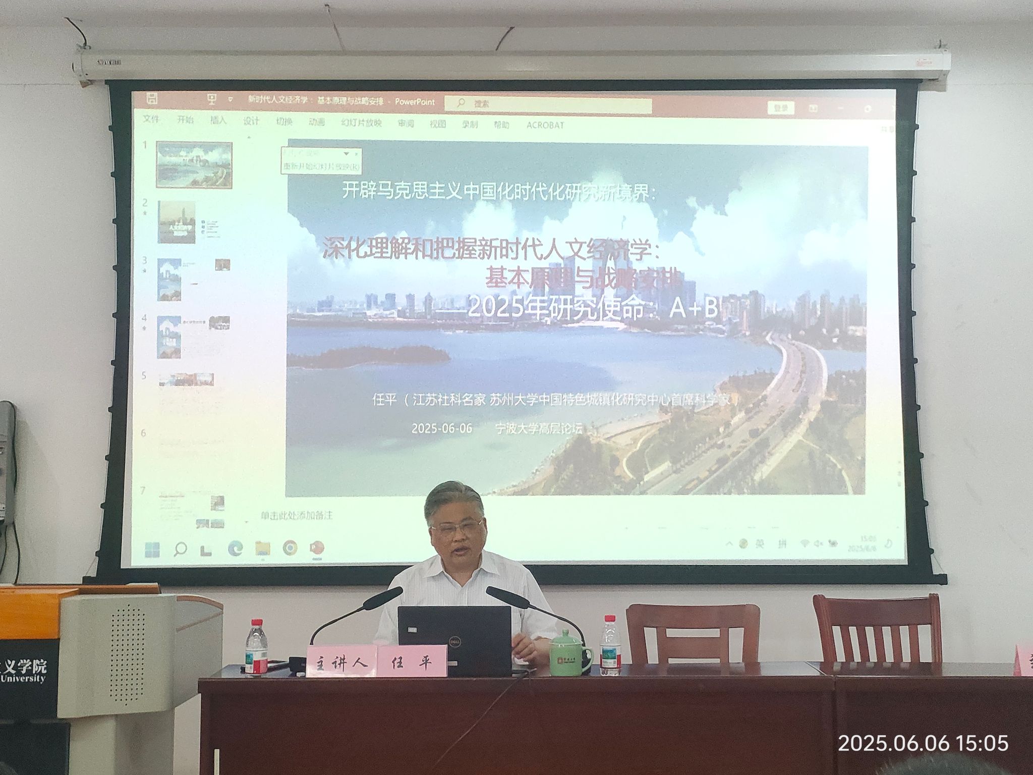 首先,任平教授以习近平总书记对“人文经济学”新论断导入阐述。认为其出场意义有:一是习近平文化思想和经济思想的必然延展和具体体现;二是引领中国式现代化高质量发展的人文逻辑;三是引领中国式现代化高质量发展的价值灵魂;四是马克思主义中国化时代化的最新重大议程。其次,任平教授认为新时代人文经济学新论断源于我国“文化经济”的繁荣发展,即改革开放以来特别是新时代以来出现在中国大地上的实践样本。其一,浙江是人文经济学新思想新观点新论断的重要萌发地;其二,苏州样本也是具有示范效应的实践样本。再次,任教授强调从中华优秀传统文化、外来优秀文化和马克思主义中蕴含的人文经济理论观点来构建新时代人文经济学自主知识体系。最后,任教授认为需要提纲挈领地布展人文经济学创新理论的基本格局,有五方面内容:一、准确把握习近平总书记系列重要讲话中人文经济学的本质内涵;二、深刻把握人文经济学基本特征;三、准确把握人文经济学主要功能;四、深刻把握人文经济发展内在规律。五、深度把握人文经济学基本原理。