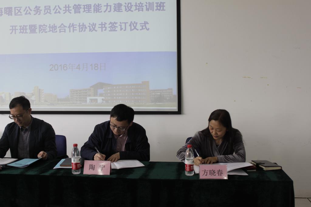签订,马院党总支书记方晓春与海曙区人社局局长陶宁分别代表双方在协议上签字,标志着双方在科研、培训、创新创业等方面长期合作的开始。人社区副局长贺海宁、办公室主徐辉、公务员与事业单位管理科科长王芳芳及海曙区各单位部门的50余名基层优秀公务员参加了签约仪式。