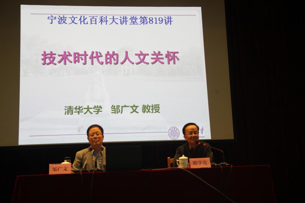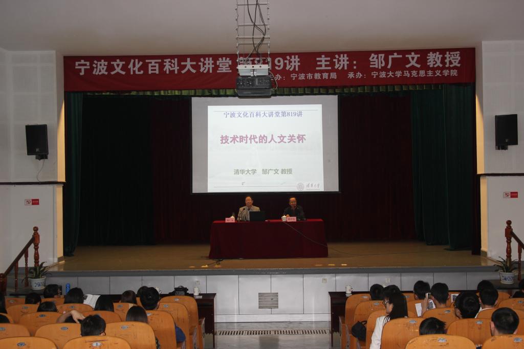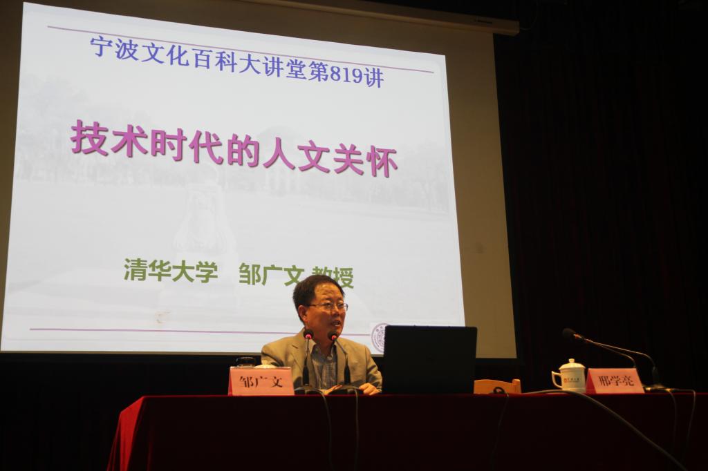 5月22日下午,《宁波文化百科大讲堂》第819讲在锦绣小剧场举行。来自各学院200余名师生聆听了清华大学邹广文教授所作的题为《技术时代的人文关怀》的讲座。本次讲座由大讲堂组委会执行主任、原宁大党委副书记邢学亮主持,由成人有声小说