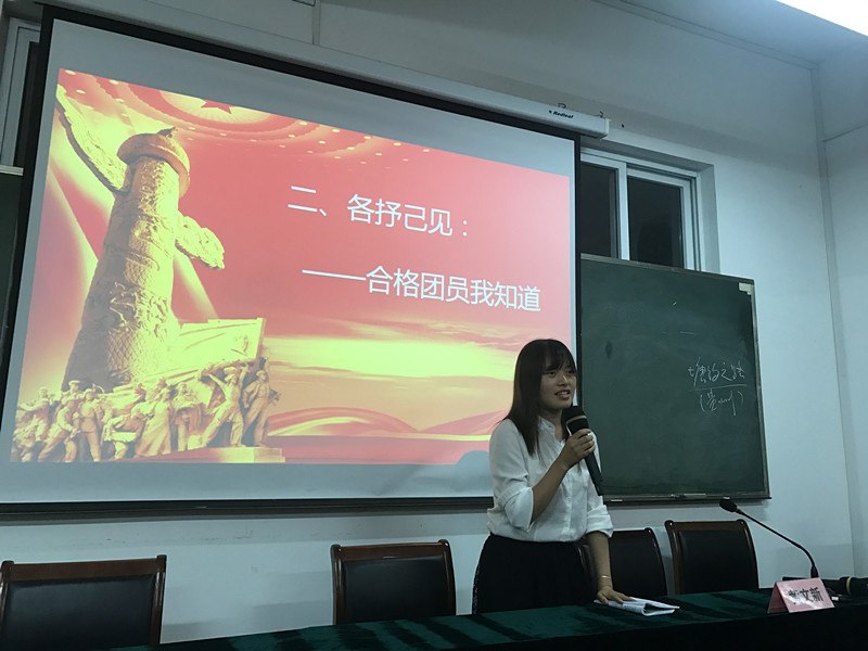 团总支副书记余嫚同学为在场团员带来了一堂生动的团史团情课,从共青团的发展历史和现状出发,话青春勇担当,鼓励马院青年团员争做共青团理论理论宣传者。第二部分“青春敢担当,合格团员我知道”中,团支部成员王斌、黄文鑫、张若冰分别作了发言。