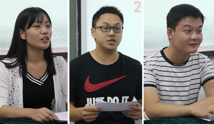 典礼上,方晓春书记代表全院教师欢迎新生的到来。2015级研究生孙雪(图四左一)、2016级本科生张家弘(图四中)和2017级研究生王帅(图四右一)分别代表老生、新生发言。陈正良院长作了开学典礼讲话,向全体新生提出了三点要求:一是时刻坚定马克思主义者的信念,保持清醒的主体自觉性;二是要建立自己的努力目标;三是珍惜研究生宝贵光阴,培养自身德性,提升内涵素养。