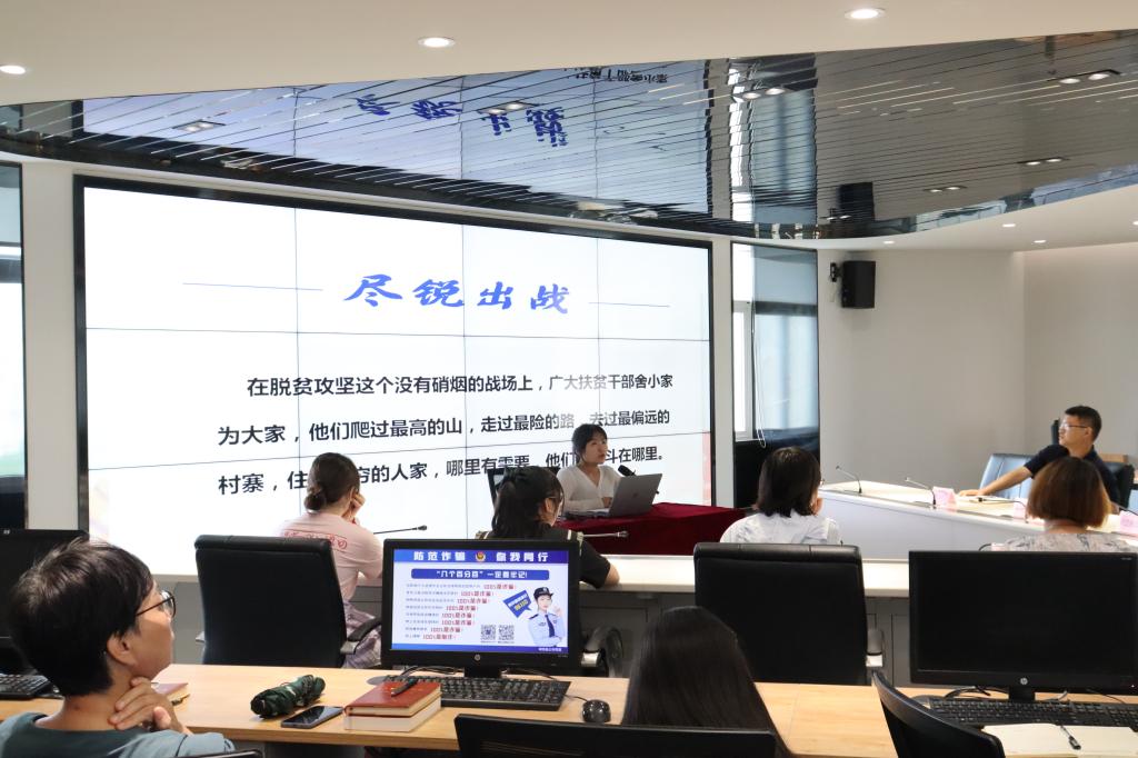 随后,小分队赴嵊泗县融媒体中心进行宣讲活动。王瑾同学对脱贫攻坚精神进行了解读,并与县融媒体中心的工作人员进行互动、交流;张丹同学以《弘扬伟大的抗美援朝精神》为主题进行了宣讲。