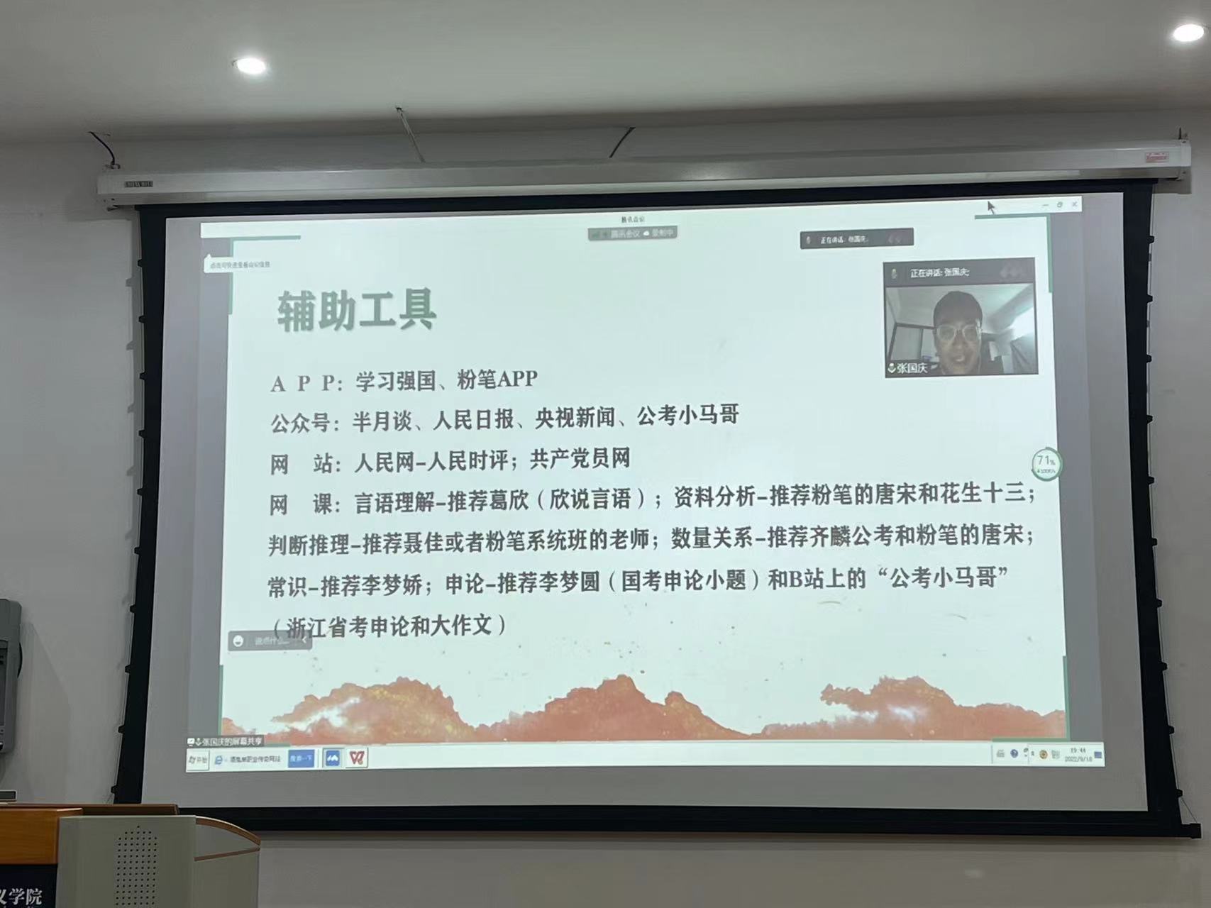 2020级研究生耿可欣同学围绕学术研究、论文写作、毕业去向和良好习惯四方面内容作了交流,并就导师交流、计划安排等介绍了自己的学习经验。2015届毕业生、考取中国人民大学博士并留校任教的周康林,就考博过程的报考目的、目标选择等谈了自己的体会,同时着重强调了考博过程的门槛要求并提供了相关建议。2022届毕业生、现就职于天津市税务局的张国庆结合备考经历介绍了考公过程中的基本情况,分享了自己对于各科的时间安排和获取信息的技巧。2022届毕业生、现为浙大宁波理工学院的思政课教师芦敏敏围绕自己的考编经历谈了自己的感悟,解读了近年思政课教师需求变化和各单位考编要求,她鼓励同学们要勇于尝试,注重积累,找到合适自己的工作岗位。