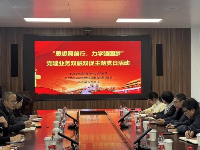 2024年12月25日下午,为积极响应党中央号召,深入学习习近平总书记在纪念乔石同志诞辰100周年座谈会上的讲话精神,思想政治教育教师党支部、爆炸与流体力学党支部在航海楼501会议室联合开展“思想照前行,力学强国梦”党建业务双融双促主题党日活动,活动由全国高校“双带头人”教师党支部书记“强国行”专项行动爆炸团队负责人王永刚主持。