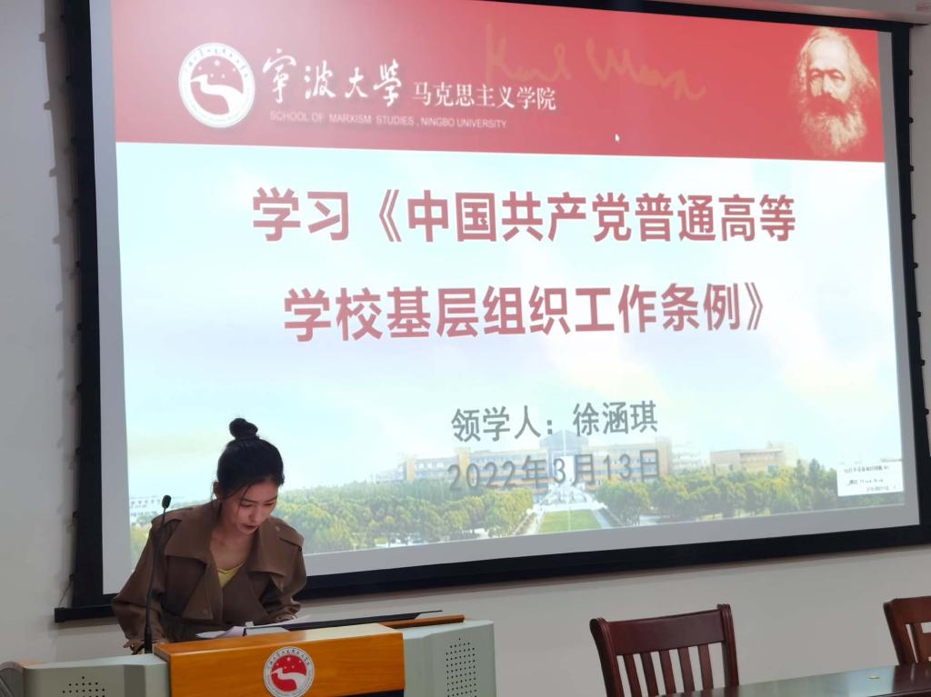 会上,研究生思政党支部组织委员徐涵琪首先讲解了《中国共产党支部工作条例》的背景和意义,就《条例》内容进行了逐条分析与解读。她表示,《条例》作为中共党史上第一部关于党支部工作的基础主干法规,是新时代党支部建设的基本遵循,每个党员都要认真学习。研究生马原和国外马党支部支部书记耿可欣围绕“三会一课”专题,结合自身党建工作经历,向大会作题为《认真落实“三会一课”》的精彩汇报。她认为,坚持“三会一课”制度,可以使党员经常接受党性教育,提升政治觉悟,提高工作水平,从而适应新形式,更好地完成党的各项工作任务。