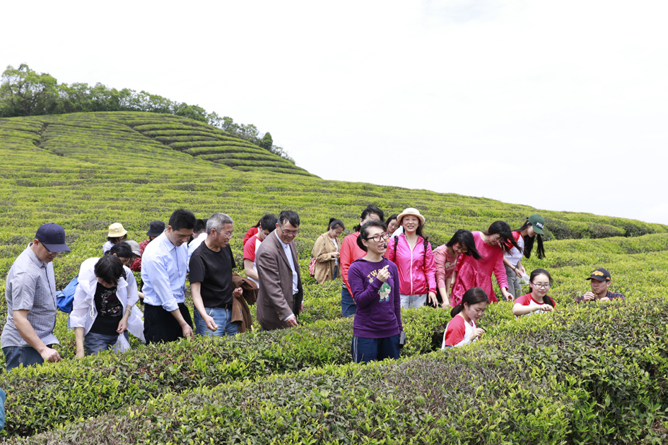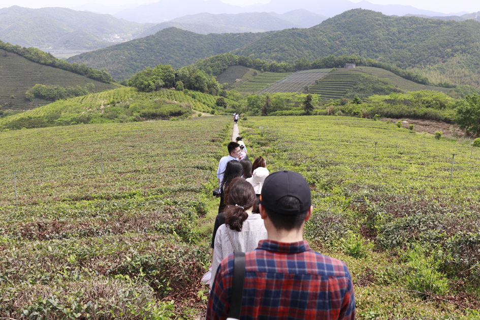 在黄避岙乡工会主席吴伍的陪同下,学院党总支书记方晓春率领老师们首先体验了徒步登山采茶。站在满目翠绿的茶山之巅,看着眼前的绿水青山,呼吸着沁人心脾的新鲜空气,体会着习总书记“绿水青山就是金山银山”这句话的深刻含义,老师们深有感触。学院“金嗓子”朱珂老师不由带动起老师们兴奋地唱起了歌曲《我们的田野》。