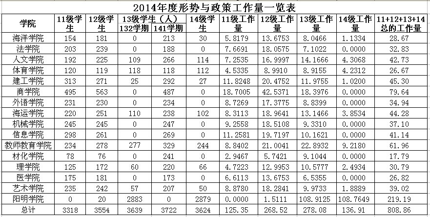 2014年度各学院组织“形势与政策”工作量详见表格,如有异议,请反馈。