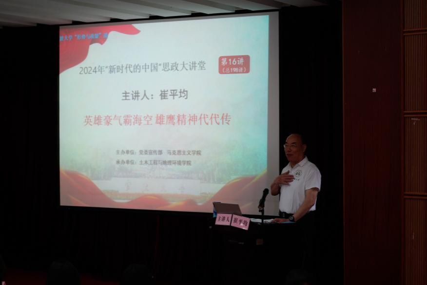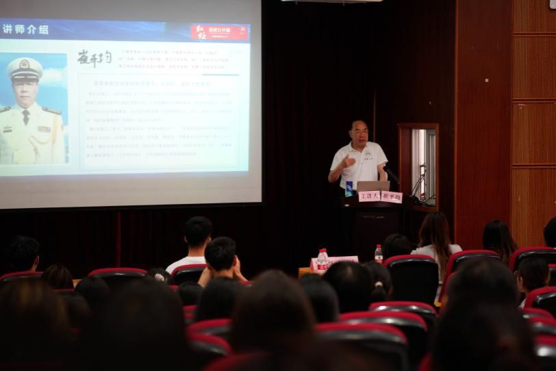 5月22日下午,海军航空兵某师原政治委员崔平均在思禹建工楼报告厅以《英雄豪气霸海空,雄鹰精神代代传》为题,为成人有声小说
