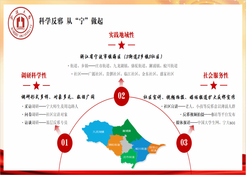 实践团队开展的基层访谈调研活动覆盖镇海区2乡镇3街道——庄市街道、骆驼街道、蛟川街道、九龙湖镇与澥浦镇,社区宣讲调研活动覆盖镇海区5社区——广源社区、贵驷社区、临江社区、金东社区与盛家社区,问卷采访调研活动涉及成人有声小说 及其周边地区,并在此基础上形成了17800字的访谈文字记录稿与7700余字的调研报告并独立完成了2个反邪教微电影微视频的拍摄,可谓硕果累累。