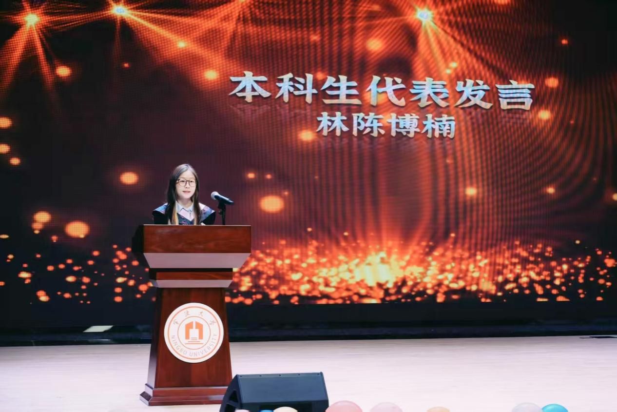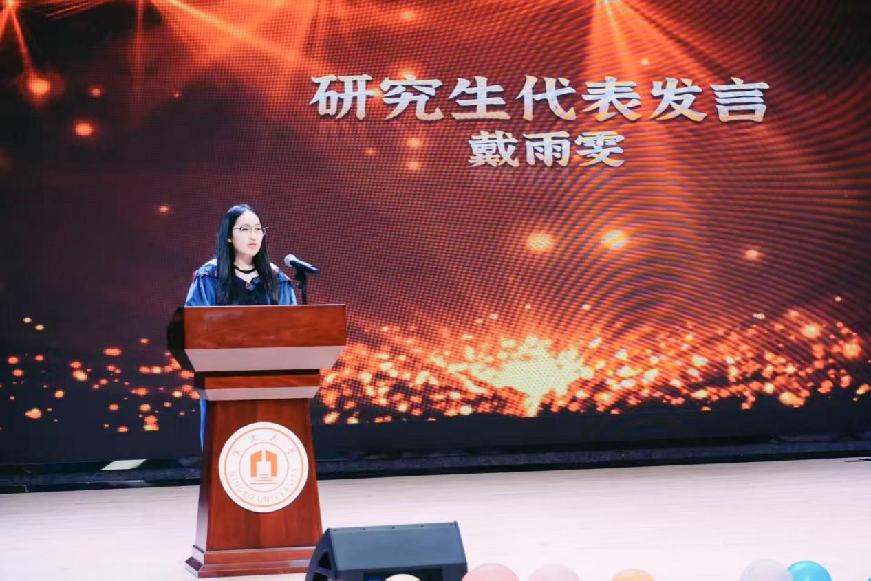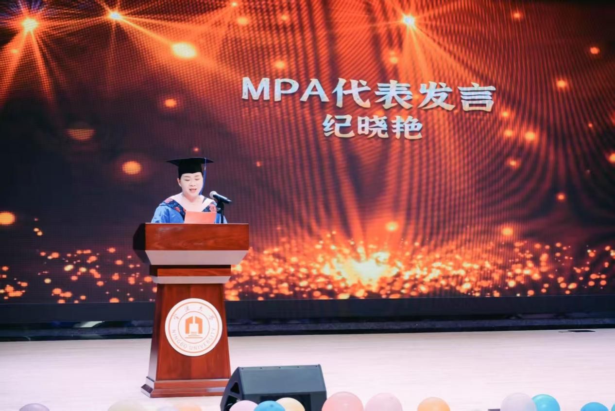 本科毕业生代表林陈博楠,回顾了自己在宁大求学的四年,对学院的感激之情溢于言表。马院成为了毕业生共同的精神家园,毕业生的每一点进步,都离不开学院搭建的优质平台,马院用行动诠释了“为学、为事、为人”的统一,为毕业生在成长路上始终有提供了一盏明灯。研究生毕业生代表戴雨雯,分享了三点感悟。一是坚定理想目标,找到成长支点,找到前进的目标与方向,立足于未来的职业规划,向下扎根,方能向上生长;第二勇于接受挑战,打造竞争王牌,人生要多磨练,从而全面发展;第三培养家国情怀,升华人生价值。希望毕业生们以今日为起点,在崭新的人生篇章上、去更广阔的天地间,书写“强国有我”的时代答卷。MPA代表季晓艳发言,她分享了自己在这三年中,肩负着家庭、工作、学习的多重压力,那些挑灯夜读的深夜,都是在工作时间挤出的学习时间,这些都成为了人生中难以忘怀的经历,这些奋斗的日夜,都成为了日后宝贵的财富。