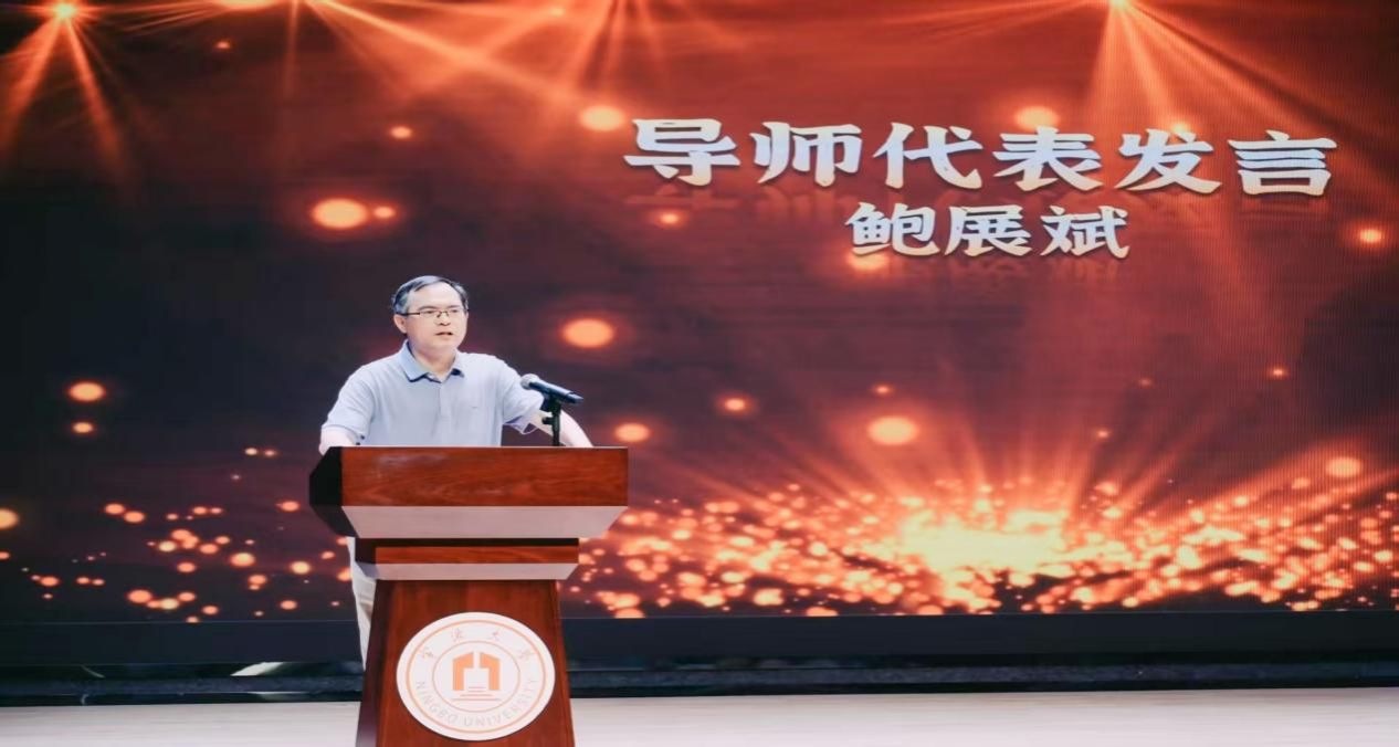 导师代表鲍展斌老师赠言学生,鲍老师说道,同学们,在未来的日子里,无论大家身处何方,从事何种职业,都请记住,知识是改变命运的钥匙,品德是为人之本,希望大家能够保持对学习的热情,对生活的热爱,以及社会的责任感。他进一步鼓励毕业生们要勇于面对挑战,敢于创新,不断追求卓越,愿毕业生们在未来的道路上,能够不忘初心、砥砺前行,用自己的智慧和汗水写出属于自己的精彩篇章。