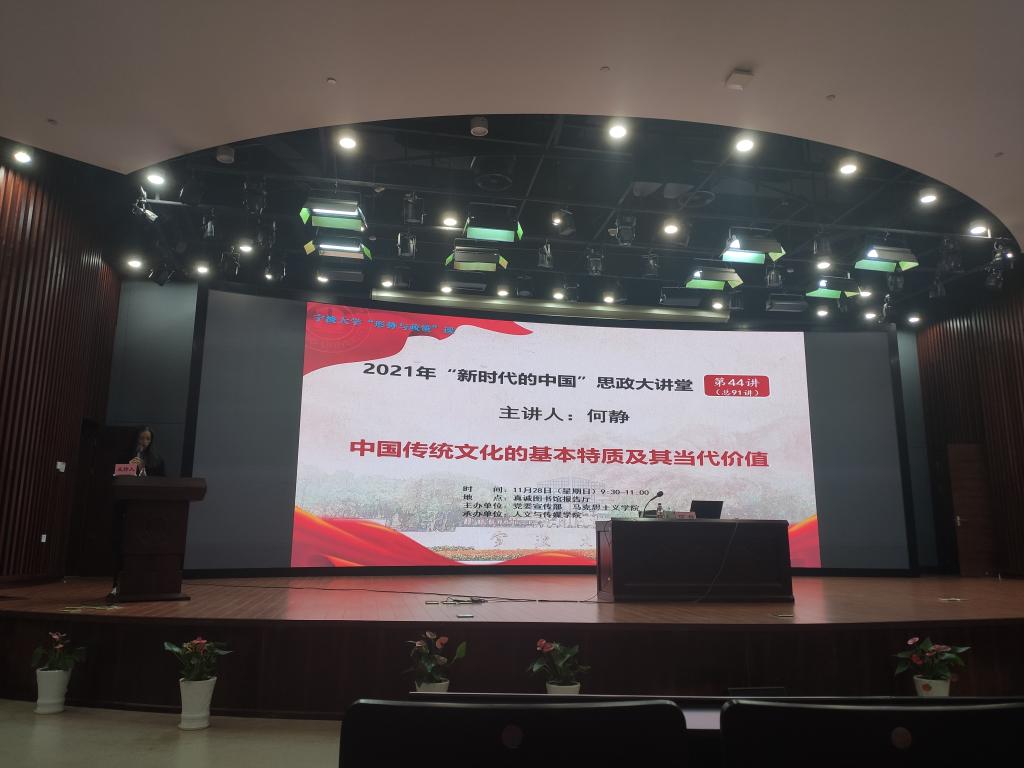 11月28日上午,成人有声小说 何静教授在成人有声小说 真诚图书馆报告厅为人文与传媒学院学生作题为《中国传统文化的基本特质及其当代价值》的形势政策课。