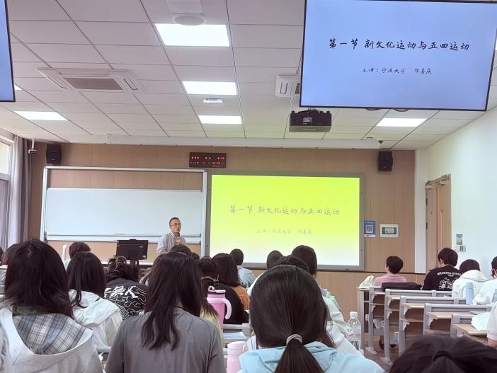 此次郑善庆老师主讲的课程是《中国近现代史纲要》中“新文化运动与五四运动”专题的内容。首先,郑老师按照以往课程设计要求让同学分享访谈作业的内容及心得。其次,郑老师结合时代背景,以关键词“三个一”的形式导入课程,带领同学们从背景、代表人物、思想观念等方面学习了新文化运动与五四运动的发生、发展及意义。最后,郑老师和同学们一起探讨了在新文化运动与五四运动的社会思潮影响下,马克思主义在中国的传播及影响。