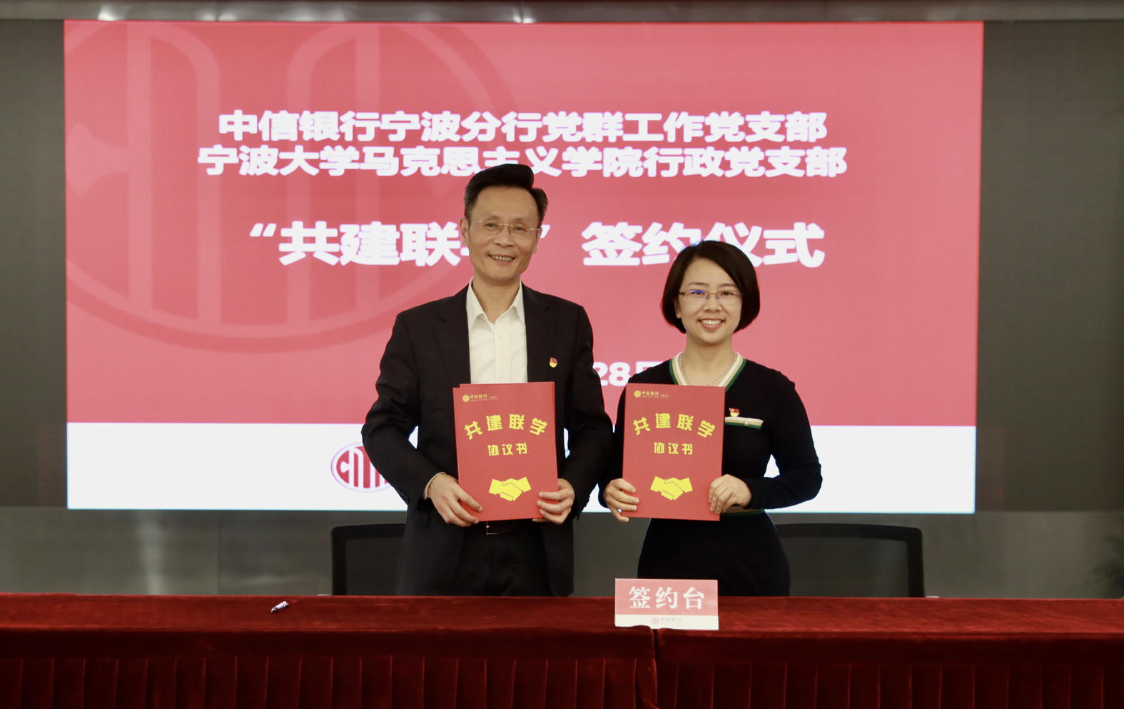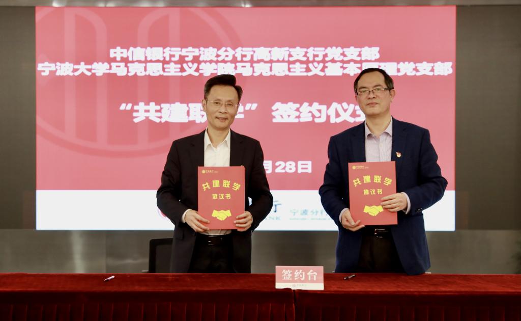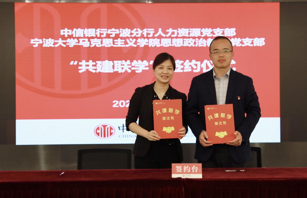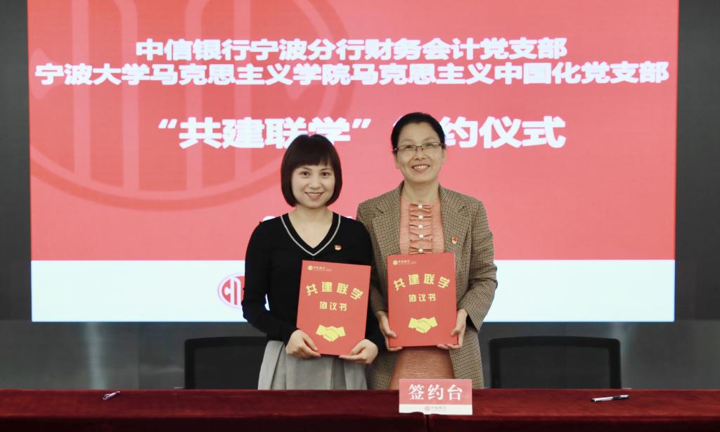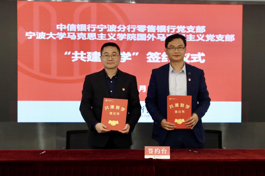党总支与中信银行宁波分行决定建立校企党建联盟。4月28日,在中信银行宁波分行会议室,学院党总支与中信银行宁波分行机关党委共建签约,校企双方负责人为党建联盟授牌。同时,行政党支部、马克思主义基本原理党支部、马克思主义中国化研究党支部、思想政治教育党支部、国外马克思主义研究党支部分别与党群工作党支部、高新支行党支部、财务会计党支部、人力资源党支部、零售银行党支部等5个党支部签署“共建联学”二级协议。中信银行宁波分行党委委员、纪委书记、机关党委书记王立民、党委宣传部部长姚小荣出席了会议。