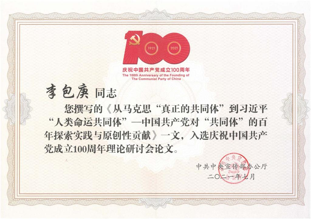 7月1日至2日,庆祝中国共产党成立100周年理论研讨会在北京隆重召开,中央政治局常委、中央书记处书记王沪宁同志出席会议并发表讲话。这次理论研讨会是中国共产党成立100周年庆祝活动的一项重要内容,全国共有100篇论文入选研讨会,李包庚教授的文章《从马克思“真正的共同体”到习近平“人类命运共同体”——中国共产党对“共同体”的百年探索实践与原创性贡献》入选研讨会。作为理论文章入选者,李包庚教授参加了本次研讨会。