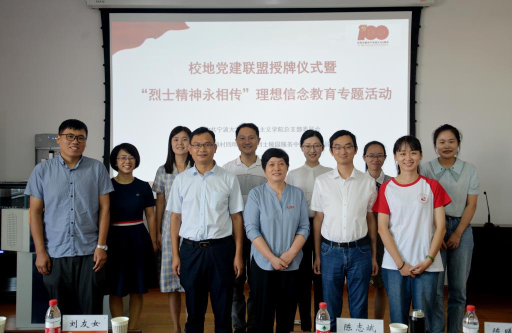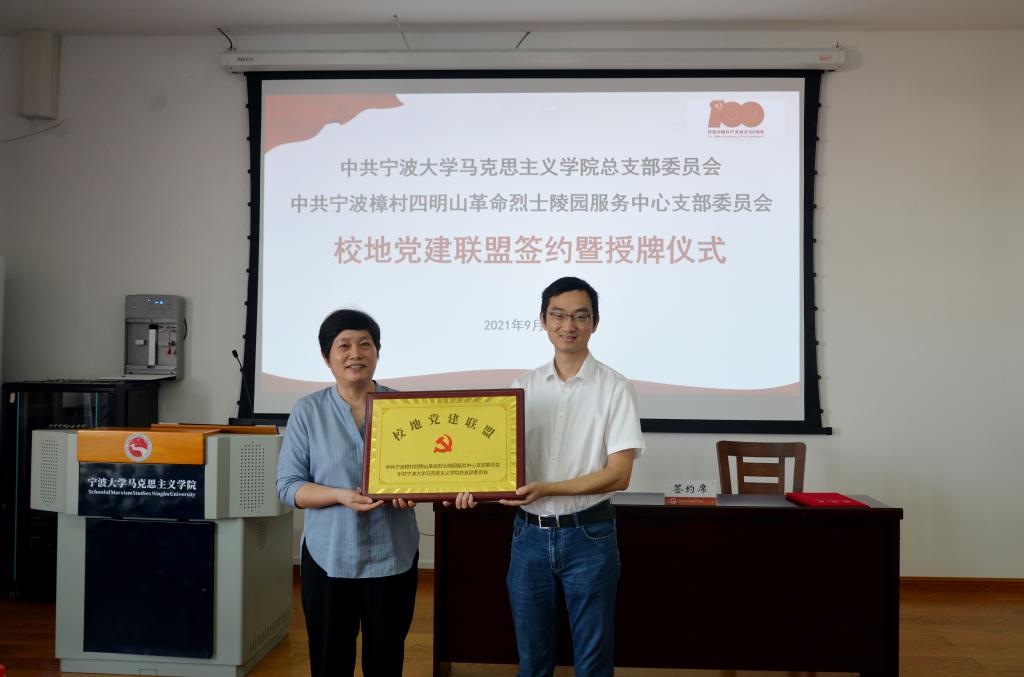 党总支与宁波樟村四明山革命烈士陵园服务中心党支部举行了校地党建联盟签约授牌仪式。宁波樟村四明山革命烈士陵园是全国爱国主义教育基地、党和国家的红色基因库,双方深化校地合作,共建“学习研究宣传教育共同体”,发挥党建引领作用。