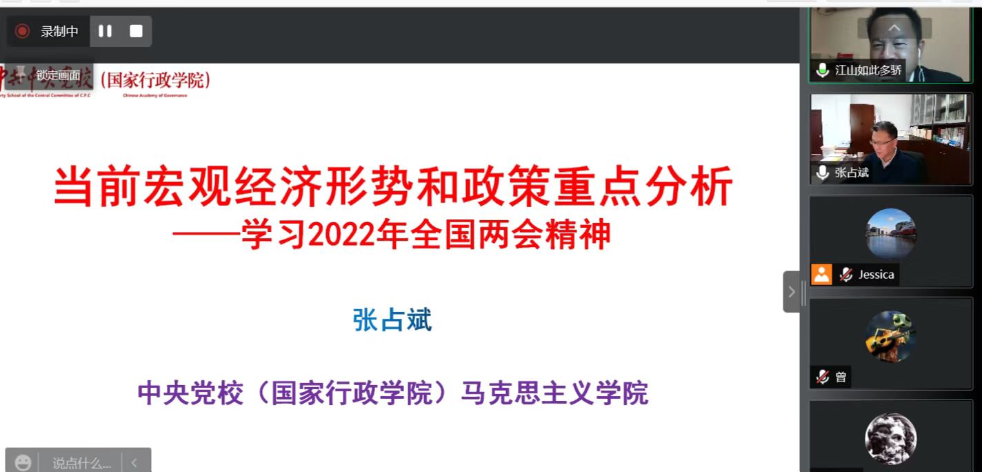 张占斌教授以我国正处于跨过中等收入陷阱的关键时期为切入点,指出当前我国面临着长短期问题的双重压力。他认为,中国经济发展具有强劲韧性和优势,只有坚持中国共产党的坚强领导、坚持中国特色社会主义制度,才能不断开创经济又好又快发展新局面。张占斌对2022年《政府工作报告》作了全面梳理,分析了报告的总体变化主要集中在稳经济、促创新、惠民生三大方面,并从经济、政策、思想等方面深入解读了关于稳中求进总基调、完善宏观经济政策、制定实事求是的发展指标、体现以人民为中心、对政府工作人员提出更高要求等五大亮点。就我国现在面临的重大理论和实践问题,张占斌指出,要正确认识和把握实现共同富裕的战略目标和实践途径,正确认识和把握资本的特性和行为规律,正确认识和把握初级产品供给保障等重大理论与实践之间的关系;并肯定了浙江省作为共同富裕示范区的所出台的政策和“做大蛋糕,做实蛋糕”实践经验的探索。张占斌强调,要营造以经济建设为中心的浓郁舆论氛围和鲜明政治生态,就是要深化对坚持以经济建设为中心重要性的认识,牢牢把握社会主要矛盾变化和中心任务,营造解放、发展、保护生产力的良好社会环境和向上的积极氛围。