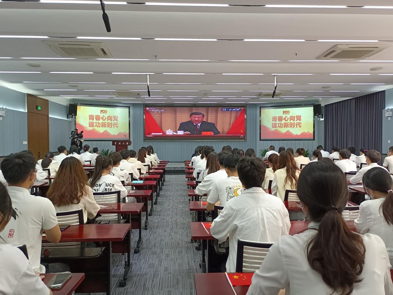 研二学生宋国杰身披红色绸带,和其他优秀青年代表一起集中收看庆祝中国共产主义青年团成立100周年大会直播。学院党总支书记刘友女、团委书记杨曼也分别带领学院团支部先进团员青年、学生代表,在成人有声小说