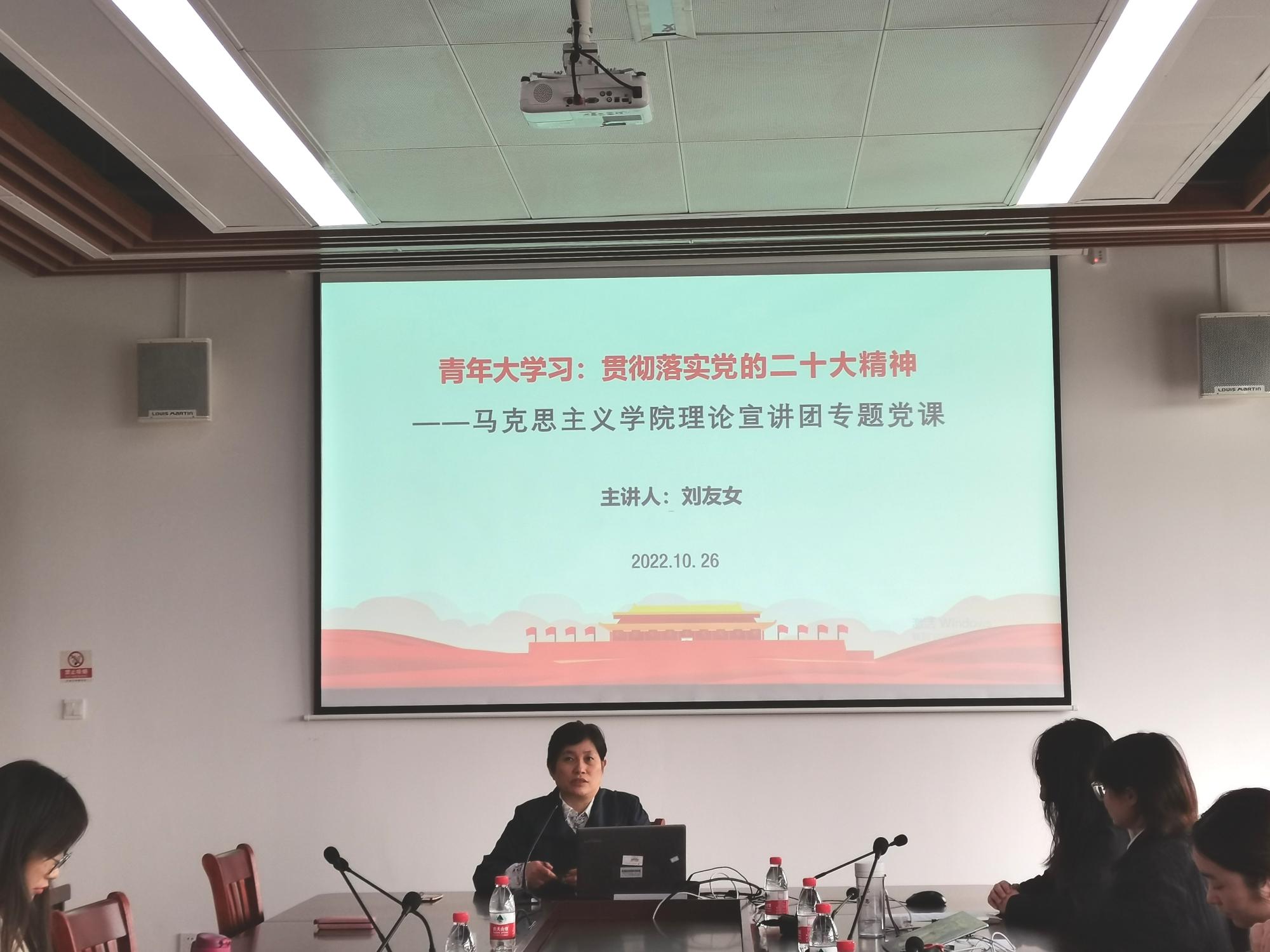 刘友女以《青年大学习:贯彻落实党的二十大精神》为题,领学党的二十大精神。她从党员数量、结构角度指出,中国共产党是一个具有青春特质的党,且具有明显的先进性。刘友女用“一个高举,三个全面”为主线,将党的十八大到党的二十大的会议主题串联起来,挖掘相同主线领导下的“新高度、新跃升”,用结构性创新的视角深入剖析了二十大报告中的新观点、新论断、新思想。刘友女的报告深入浅出,让大家更深切地理解领悟“人民日用而不觉”等生活实例中所蕴含的精神力量,受益匪浅。